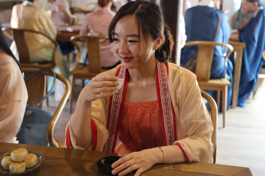 几位外籍师生衣袂飘飘,来到茶室,观看了传统的茶道表演。他们观察着每一个细节,仔细向老师请教着茶道的礼仪。之后,他们也端起茶杯,细细地品味着这一杯“东方味道”。“太香了,”外教阿伦激动地说,“我还学到了很多中国的礼仪,我已经迫不及待地想为我的朋友们泡一壶茶了!”