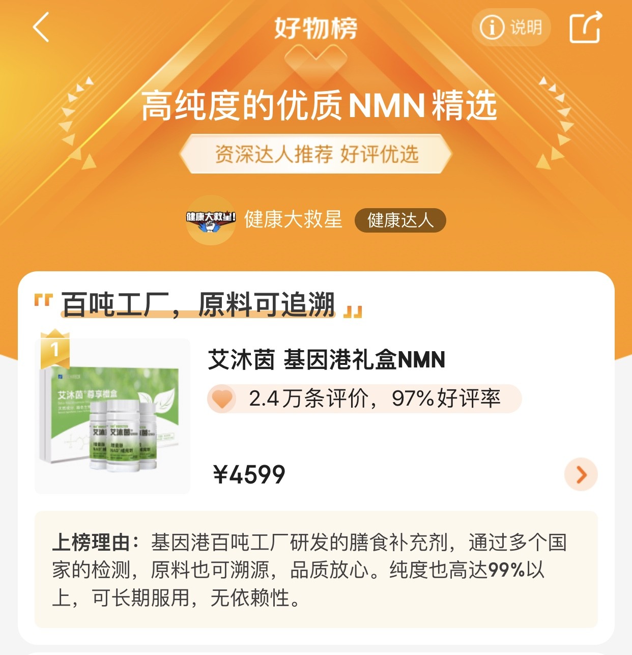 在过去三年里,基因港多次登上了京东等大型电商平台中营养保健品行业的排行榜前列,并且连续两年拿下了京东双十一、双十二购物节NMN畅销榜榜首。今年5月28日,基因港还荣获了“2021年度十大新锐品牌”奖。值得一提的是,基因港GeneHarbor海外旗舰店的基因港礼盒NMN产品更是登上了优质NMN榜榜首,成为京东官方基于京东大数据和资深达人推荐结合的好物。
