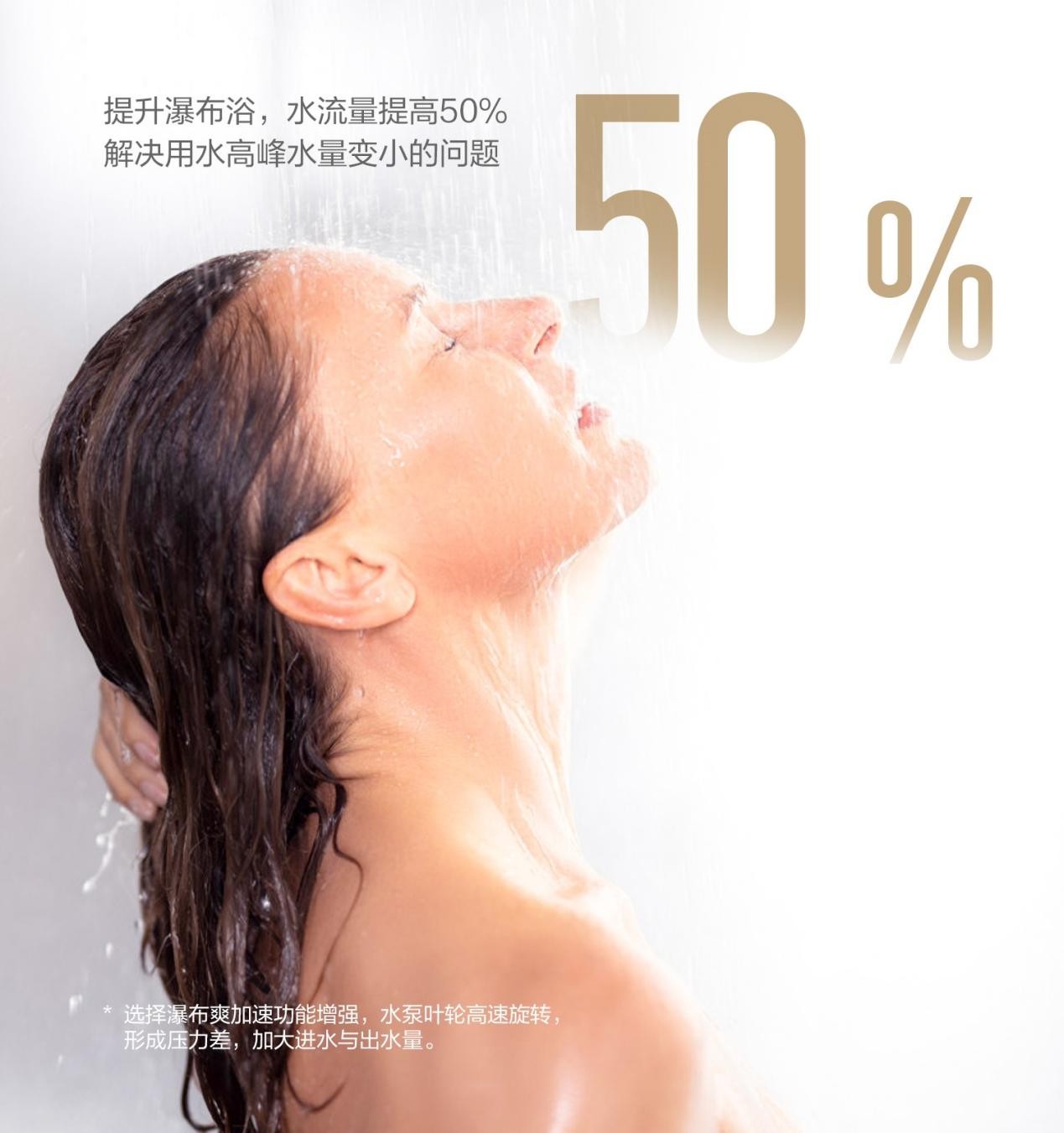 樱花热水器Q906A搭载强劲动力循环泵,10m扬程130m水路循环,长距离管道巡航,实现跃层多点供水,为全屋带来澎湃的热水,全家皆可畅享舒适热水洗涤。樱花热水器Q906A智能增压瀑布浴加速技术,最高提升50%水流量,解决用水高峰水量变小的问题,彻底告别水压“恐低症”,尽情享受加倍舒爽瀑布浴。