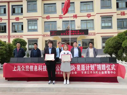上海梦饷公益集团项目负责人表示,“希望受捐赠的学校教师,把我们的爱心化做工作的动力,用优异的教学回报社会。”最后皋兰县县妇联为上海众旦信息技术有限公司、甘肃江子为民公益慈善中心送上捐赠证书。