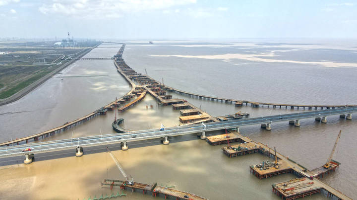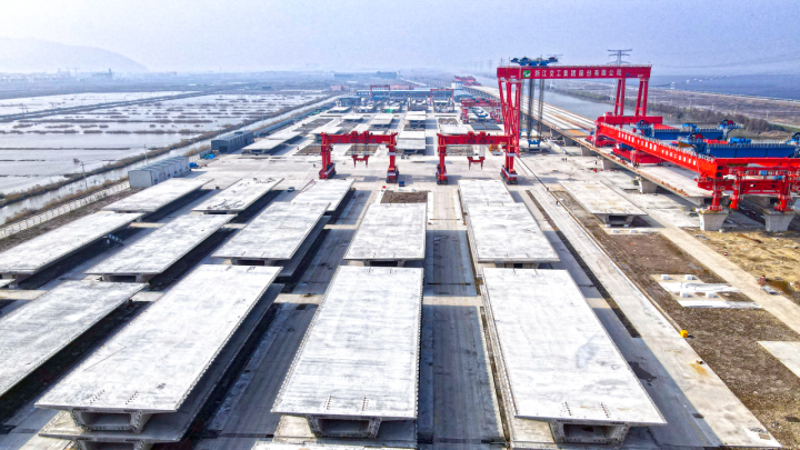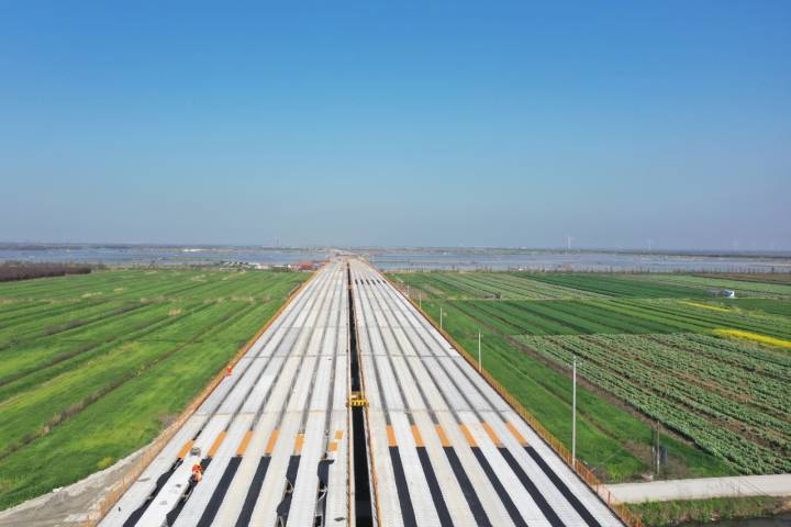 6月24日,杭甬高速复线宁波段一期工程现场,海域段栈桥累计搭设已超过2万米,近3000个墩柱巍然矗立,沿着海堤不断向远处延伸。陆域段千吨级整孔预制箱梁、预制T梁陆续架设,全线路基填筑等工作按照9月前完成的目标加紧施工,项目建设呈现又好又快推进态势。截至目前,该工程今年已完成投资14.9亿元,项目总投资179.91亿元实现了过半目标,总投资完成率达53%。
