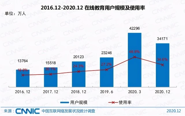同时,我国在线教育用户规模达3.42亿,占网民整体的34.6%;手机在线教育用户规模达3.41亿,占手机网民的34.6%。虽然随着疫情防控取得积极进展,学校逐渐复课,在线教育用户规模有所回落,但较疫情之前(2019年6月)仍增长了1.09亿,行业发展态势良好。