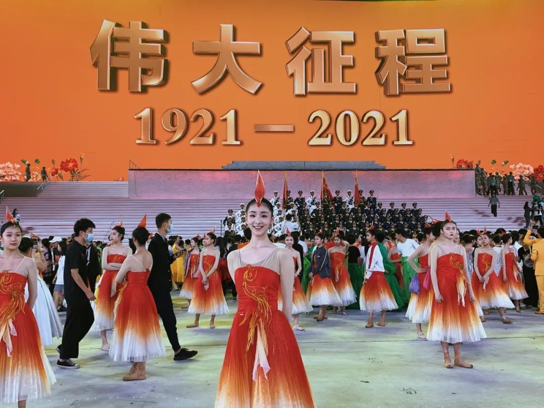 在当晚举行的庆祝建党一百周年文艺演出《伟大征程》中,宁波外事学校16级舞蹈专业的毕业生牟颖莹参演了第四篇章的情景交响歌舞《人民至上》,毕业生叶琳、任宇航、石雨艳等也参加了此次文艺演出。
