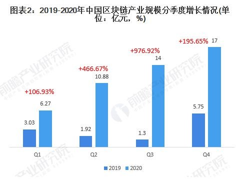 从区块链产业规模分季度情况,可看出2020年我国区块链产业增长主要在第二、第三季度,同比增长率分别达到466.67%和976.92%。从增速可看出,2020年我国区块链产业增长较为迅速,季度同比增速在100%以上。