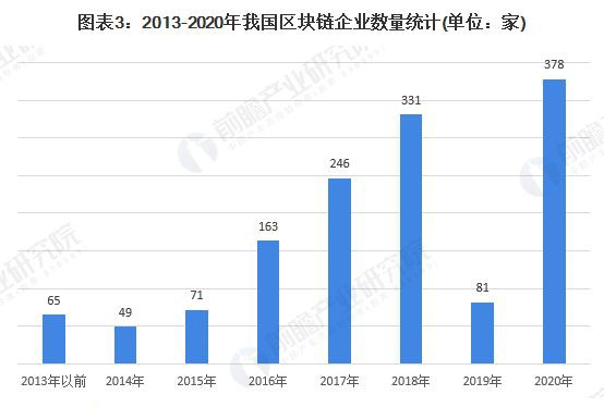 2019年,我国区块链新增企业数量仅为81家。2020年,在区块链技术不断完善、区块链产业链逐渐清晰、区块链应用落地数量日益渐增的背景下,人们对于区块链认知趋于理性,区块链企业规模与竞争实力持续升级。