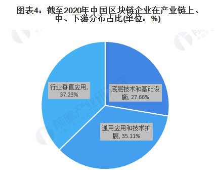 对比产业链条上、中、下游企业业务分布情况,中游通用应用及技术扩展层和下游垂直行业应用层分布占比较大,分别占比35.11%,37.23%,而上游底层技术和基础设施层占比达27.66%。由此可见,我国区块链产业链条基本形成,企业在各环节中分布较为均衡。