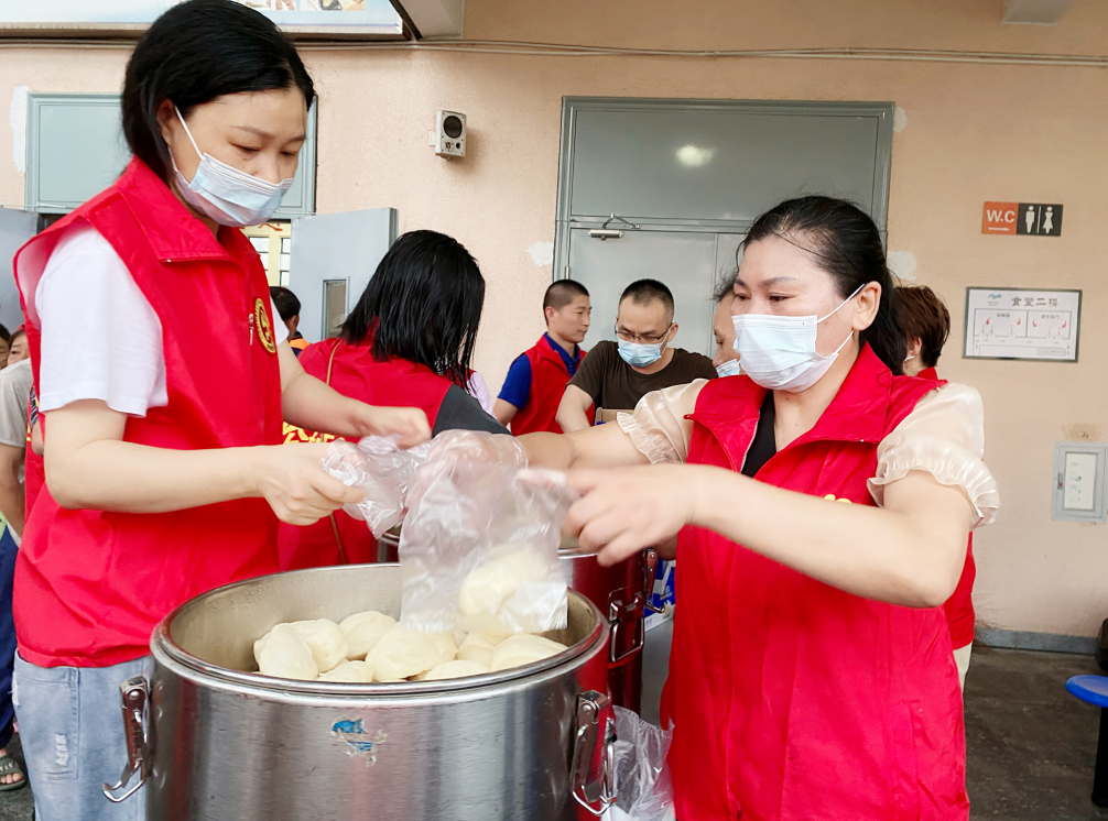 说干就干,昨晚7点开始,黄小琴夫妻俩与玉兰社区的几位党员志愿者当即行动起来:采购材料、发面、揉面、上锅蒸馒头,连夜赶制了900多个馒头,于今天一早赶着早餐时间点运送到避灾点。