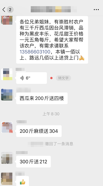 上午8时25分,在崇寿镇机关干部的一个工作微信群中,出现了这样一条消息:崇胜村有一农户3000斤西瓜因台风影响滞销,品种为黑皮丰乐、花瓜甜王,价格每斤1.50元,希望大家帮帮该农户……消息一出来,群里马上有人回复:“西瓜来200斤。”“我要300斤。”“给我们也送200斤。”一时间,大家纷纷“抢购”。“全部收到,15分钟销售完毕,谢谢大家的爱心。”8点40分,陈海锋在微信群中发出这样一条消息,结束当天早上的西瓜“销售”。