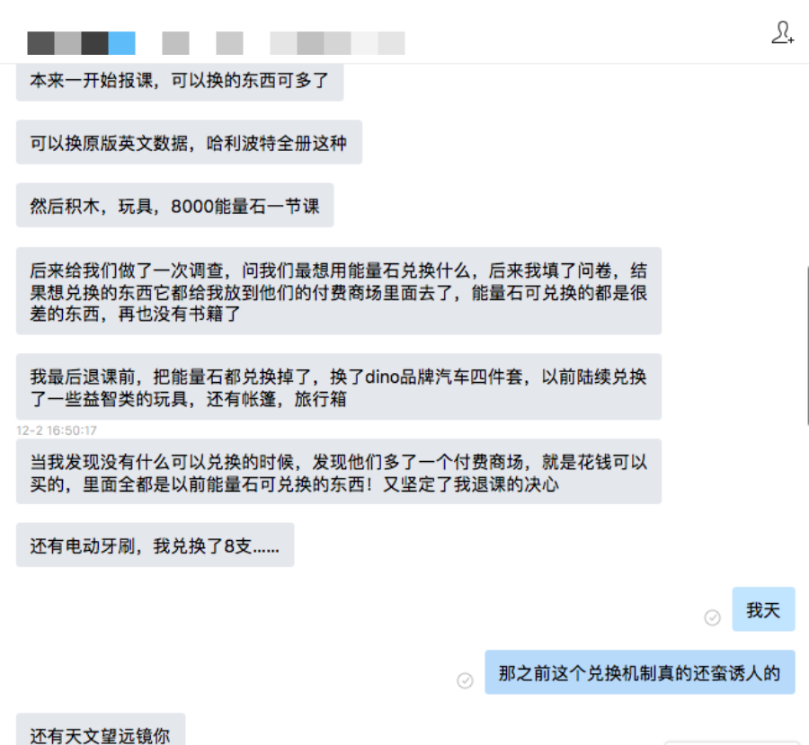 此外,小华妈妈还提到,VIPKID对家长们做过调研问卷:最想用能量石兑换什么。结果这些家长们较为想兑换的东西,最后都被放到了付费商场中。这样让小华妈妈更加坚定了退课的决心。