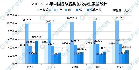 受教育是所有孩子的权利,中国对教育格外重视,实行普及九年义务教育。学前教育、小学、初中、高中、高等学校的在校学生数量不断增长,普通高中和普通中等职业学校在校学生数量小幅波动。数据显示,2020年中国学前教育在校学生4818.3万人,小学10725.4万人,初中4914.1万人,高中2494.5万人,高等学校3285.3万人。在校人数的不断增长推动了教育行业的市场需求。