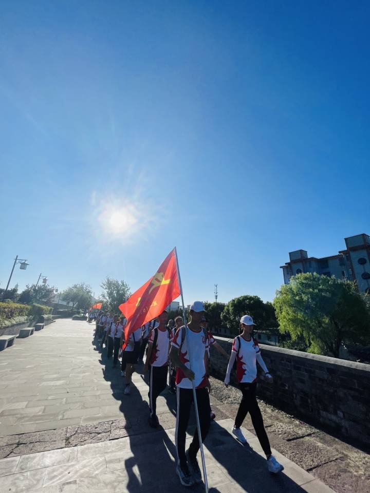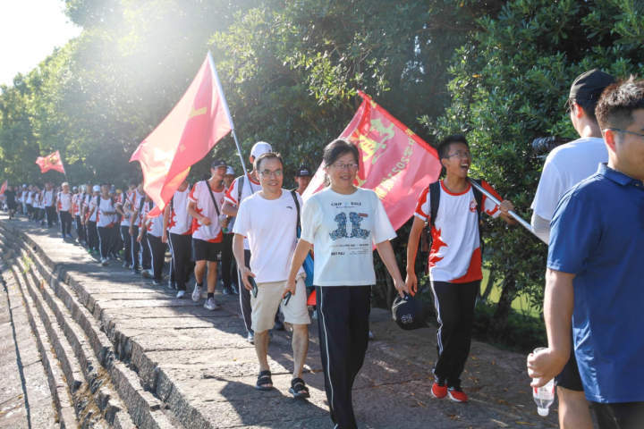一路上,镇海中学新生们扛着红旗,顶着烈日,挥洒着青春汗水。大家一路呼喊口号、拉军歌、相互鼓励、相互帮助,虽然汗水早已浸湿衣衫,但师生们始终保持高昂的士气,长长的队伍形成了一道美丽文明的风景线。