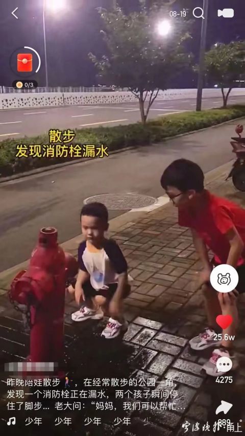 在8月18日晚,董麒睿和家人在鄞州区百丈东路散步时,发现路边的消防栓正在不断往外冒水。董麒睿向父母借了手机,先是打了“119”,随后在工作人员的指导下联系了自来水公司。等到消防栓漏水问题解决后,他才安心离开。