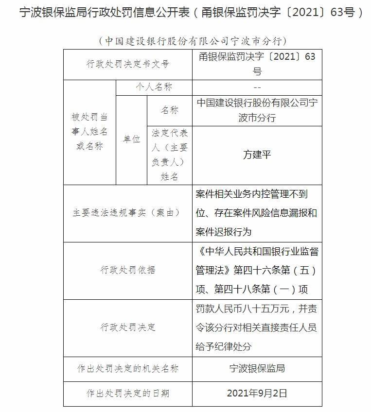 中新经纬客户端9月10日电 10日,银保监会网站公布了宁波银保监局开出的多张罚单。其中,文号为甬银保监罚决字〔2021〕63号的行政处罚决定书文号显示,因存在案件相关业务内控管理不到位、存在案件风险信息漏报和案件迟报行为的违法违规事实,中国建设银行股份有限公司宁波市分行被罚款人民币85万元,并责令该分行对相关直接责任人员给予纪律处分.