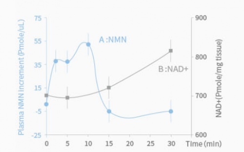 研究发现,用户服用市面上普通NMN后,功效分子于15分钟内就会释放完毕,30分钟内体内的NAD+水平即达至最高,随之下降,出现“峰谷”现象。