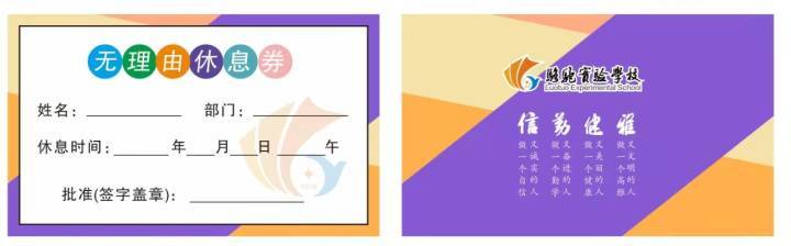 “双减”政策落地后,小学的校内课后托管延时,初中开设晚自习和周六校园资源向学生开放,老师们的工作时间无形中变长,工作压力无形中增加。为了让老师们能劳逸结合,有更充沛的精力投入到教育教学中,该校在开学初就着手研究减轻老师工作负担的方法,最终推出了“无理由休息券”。