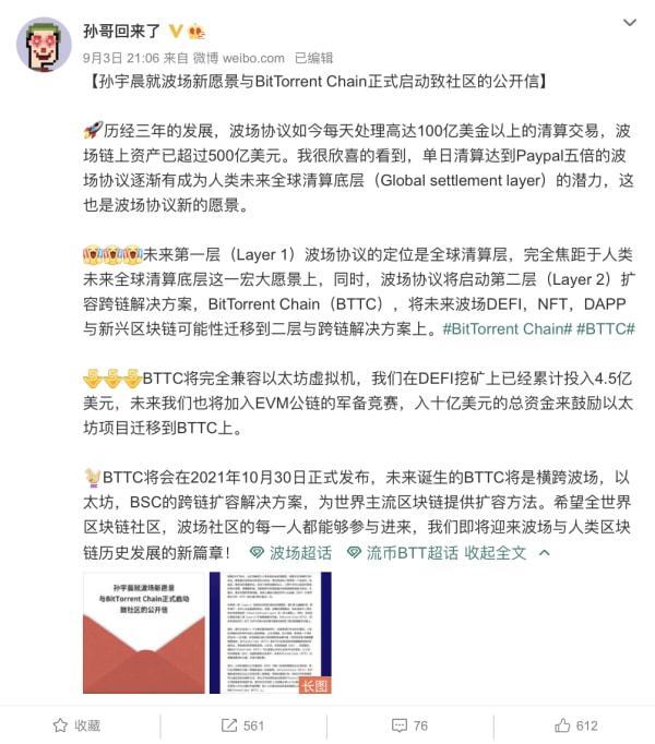 谜底在孙宇晨最新公开信有了答案。9月3日,孙宇晨发表公开信表示:BitTorrent联合波场TRON将全力进军跨链领域,正式开启BitTorrent Chain(BTTC)万链互联新时代。