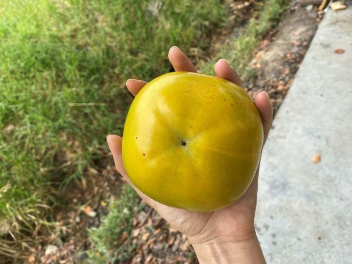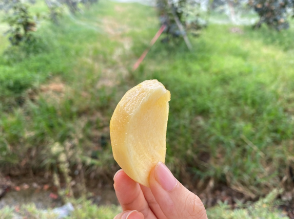 刚摘下来的柿子外表青中带黄,削皮的时候就有汁水飞溅出来的感觉。切开后,质感像苹果。放进嘴里一咬,像苹果,又像是雪莲果,脆爽多汁,还能吃出哈密瓜的味道,但没哈密瓜那么齁甜,清爽可口,甜而不腻。智农农业公司负责人黄智龙笑着说:“太秋甜柿单宁含量很低,不会吃出胃结石,放心大胆地吃!”