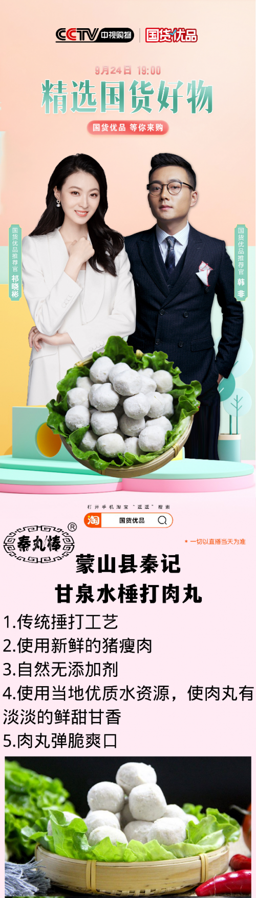 此次专场活动上,蒙山秦记甘泉水棰打肉丸产品得到了《国货优品》栏目的认可和推荐,强势入选了CCTV中视购物《国货优品》。