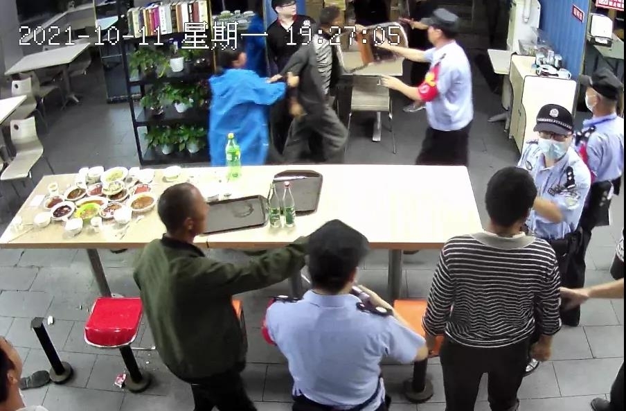 “嘭”一声,玻璃渣子散落了一地,而刘某情绪也越来越激动。怕刘某再做出危险的事情,威胁到在场人员的安全,民警和几位辅警立即上前控制刘某。
