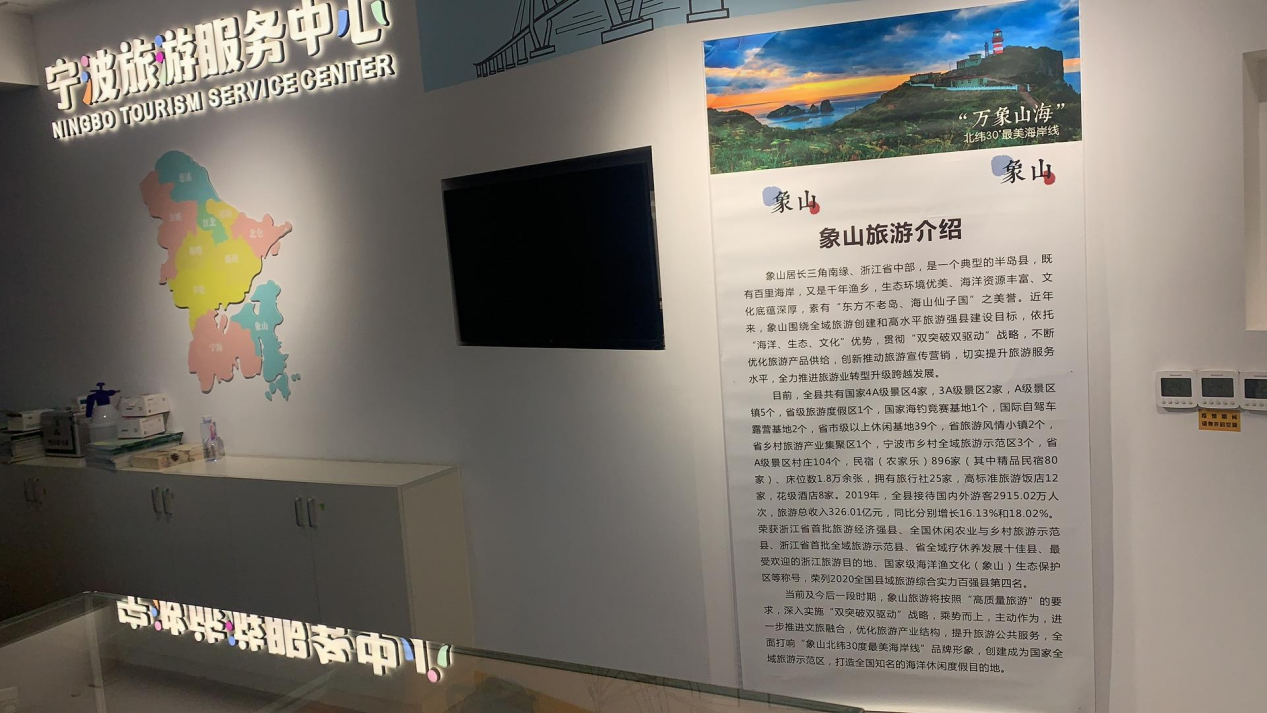 宁波市象山文旅局在宁波栎社国际机场一楼旅游服务中心进行为期两个月的主题展。该展主要以象山非物质文化遗产、书画、旅游资源整体展示为推介,借宁波机场旅游服务中心大屏幕和出发平台的文旅产品体验店进行主题展示。