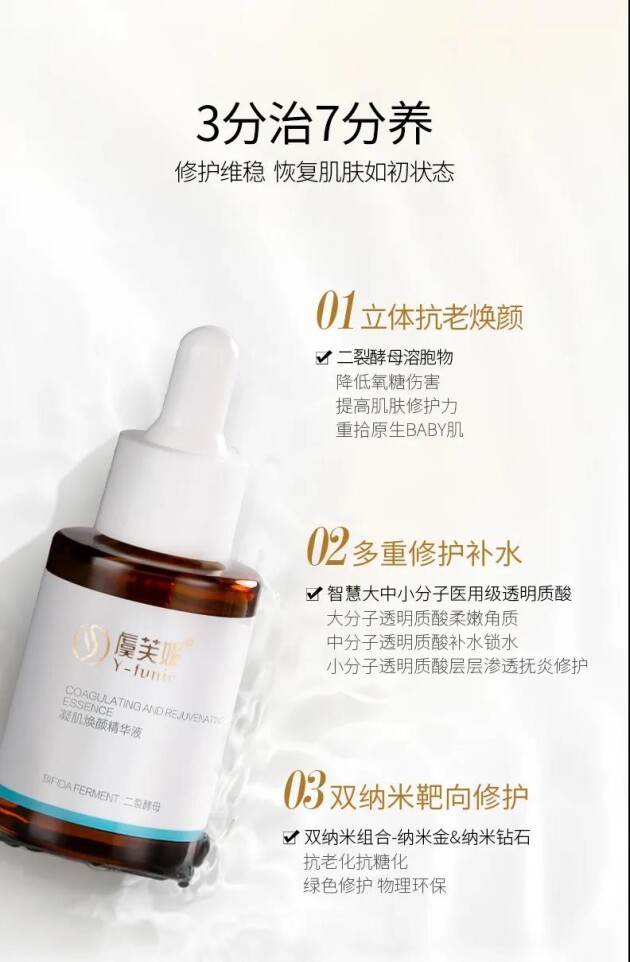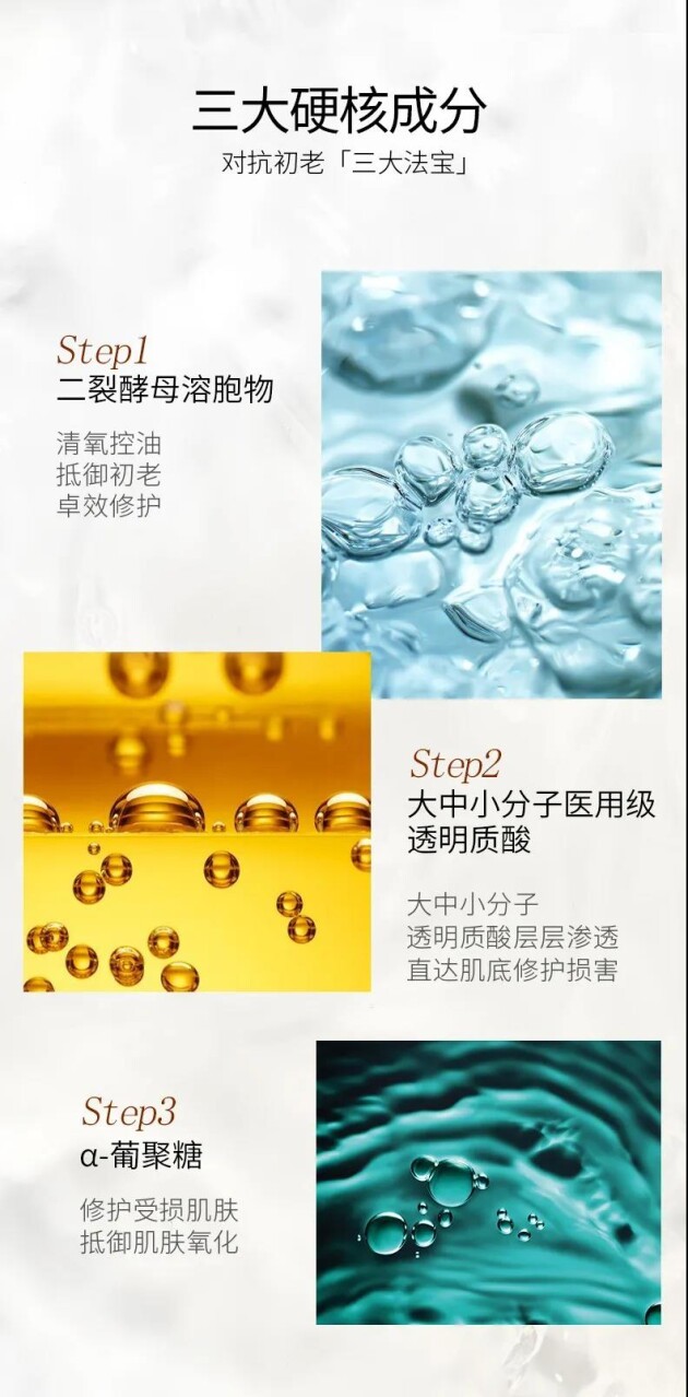 凝肌焕颜精华液,轻松对抗肌肤初老问题,驻颜时光没问题!内含三大硬核成分对抗肌肤初老,二裂酵母溶胞物修护肌肤屏障,抗光老化,焕亮肌肤 ,滋养肌底;大中小分子透明质酸层层渗透,直达肌底修护损害;α-葡聚糖修护受损肌肤,抵御肌肤氧化!
