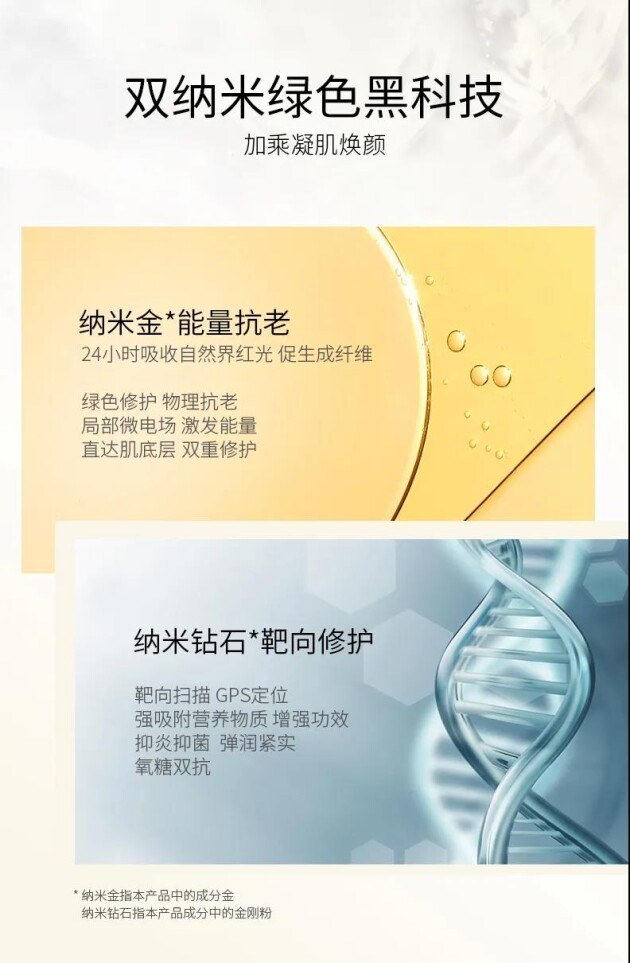最最最重要的一点就是还添加了双纳米黑科技成分,纳米金和纳米钻石绿色修护,靶向扫描,精准定位,能量抗衰~加乘凝肌焕颜!