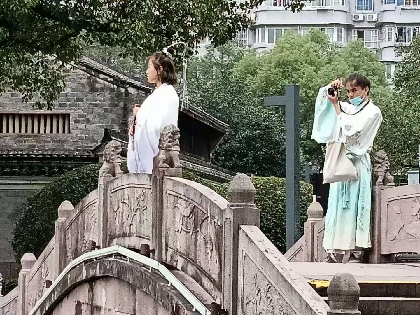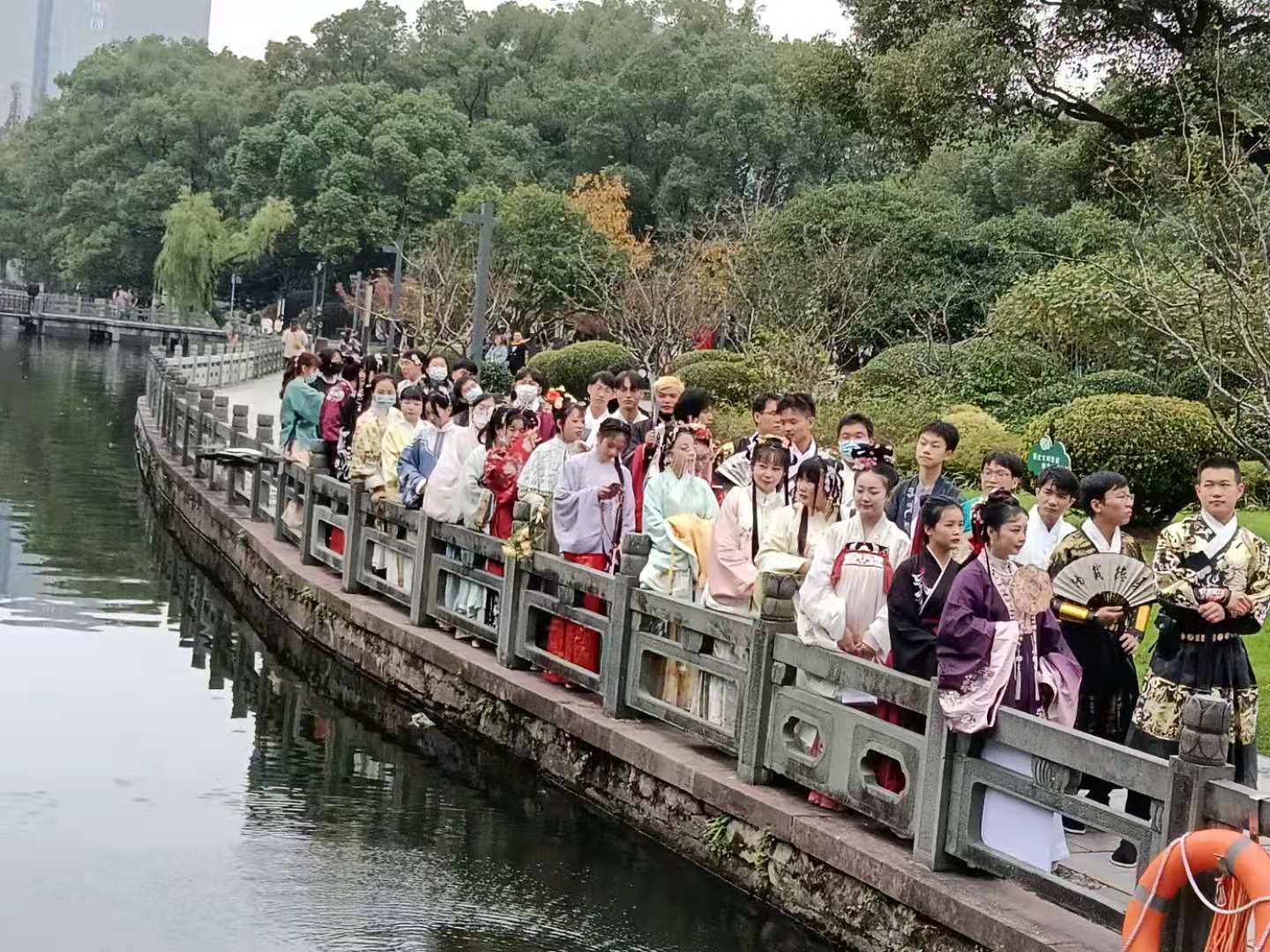 昨日的宁波月湖秋高气爽,人流如织,人们乘着周日,赶在新一拔冷空气来临前,进入景区,尽情游玩。在景区让人特别搏眼球的是,一群穿着汉服的年青男女,他们为的是明天(11月22日)的“汉服出行日”,提前“热身”着装游园。