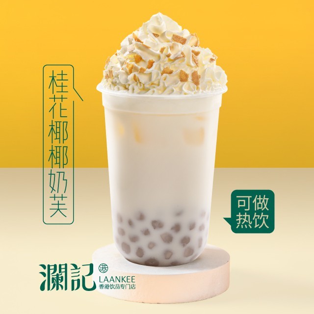 颜值控首选,清爽椰乳搭配桂花乌龙茶,芋圆小料又添口感。雪顶奶芙上还撒了香脆的黄油脆片,一整杯饮品口感和外形兼具,不得不说澜记现在的出品真的很会。