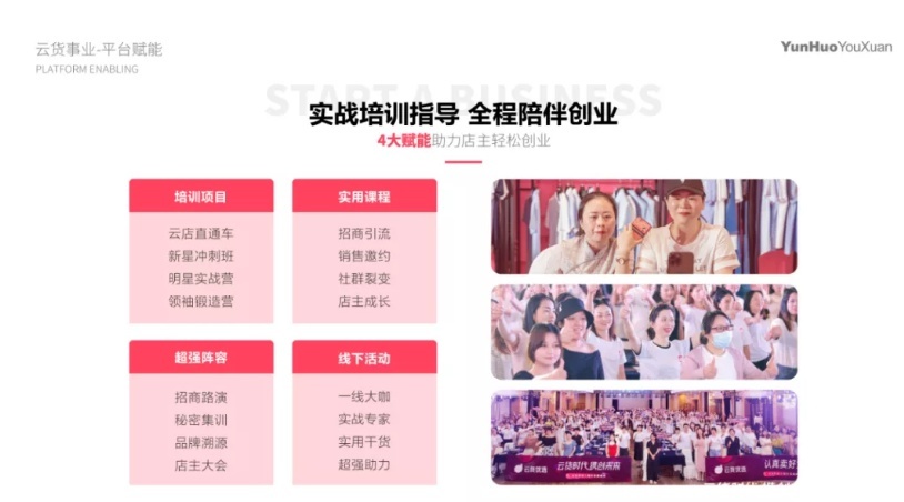 云货鲸学堂为店主搭建了完善的成长系统,从思维认知、技能技巧到团队管理等全面培训,见证从小白店主到领袖女王的蜕变,让每一位加入的店主轻松成为移动电商的专业领袖,同时还启动了各类线上线下沙龙及会议,帮助店主拉新和成长。