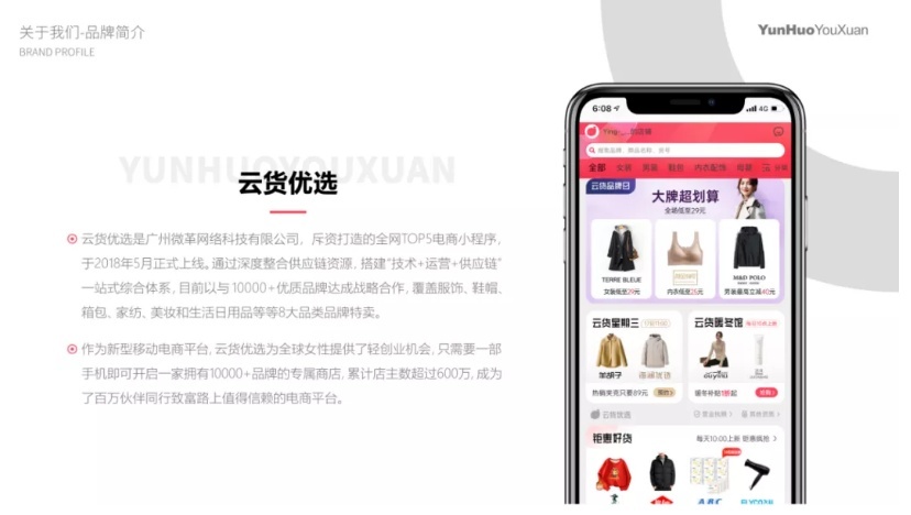 云货优选是广州微革网络科技有限公司,斥资打造的全网TOP5 电商小程序,于2018年5月正式上线。通过深度整合供应链资源,搭建“技术+运营+供应链”一站式综合体系,目前已与10000+优质品牌达成合作,覆盖美妆、食品、家居、鞋靴、箱包、童装、母婴、食品等8大品类品牌特卖。