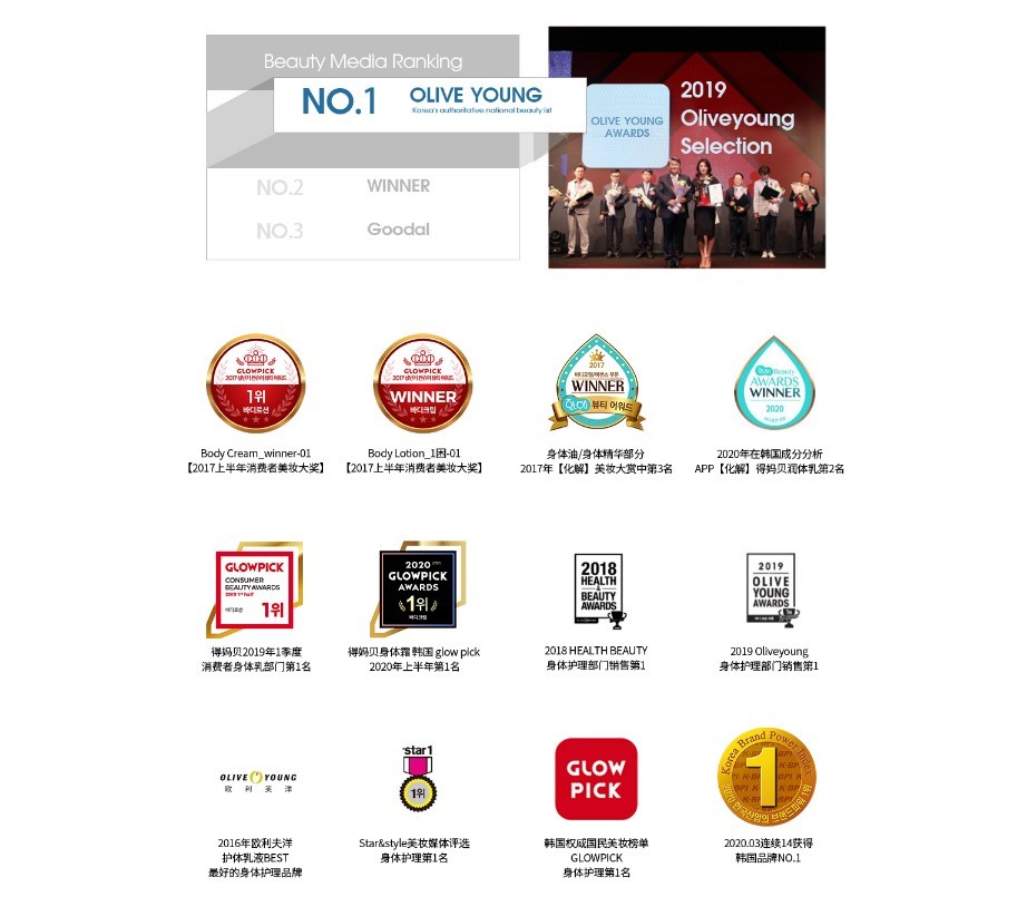 以近期获奖举例,DermaB身体霜获得韩国 glow pick 2020年上半年第一名,2020年在韩国成分分析APP【化解】里面,DermaB润体乳获得第二名 ,Body Cream_winner-01获得【2017上半年消费者美妆大奖】,Body Lotion_1-01获得【2017上半年消费者美妆大奖】,身体油 身体精华部分 获得2017年【化解】美妆大赏中第三名。
