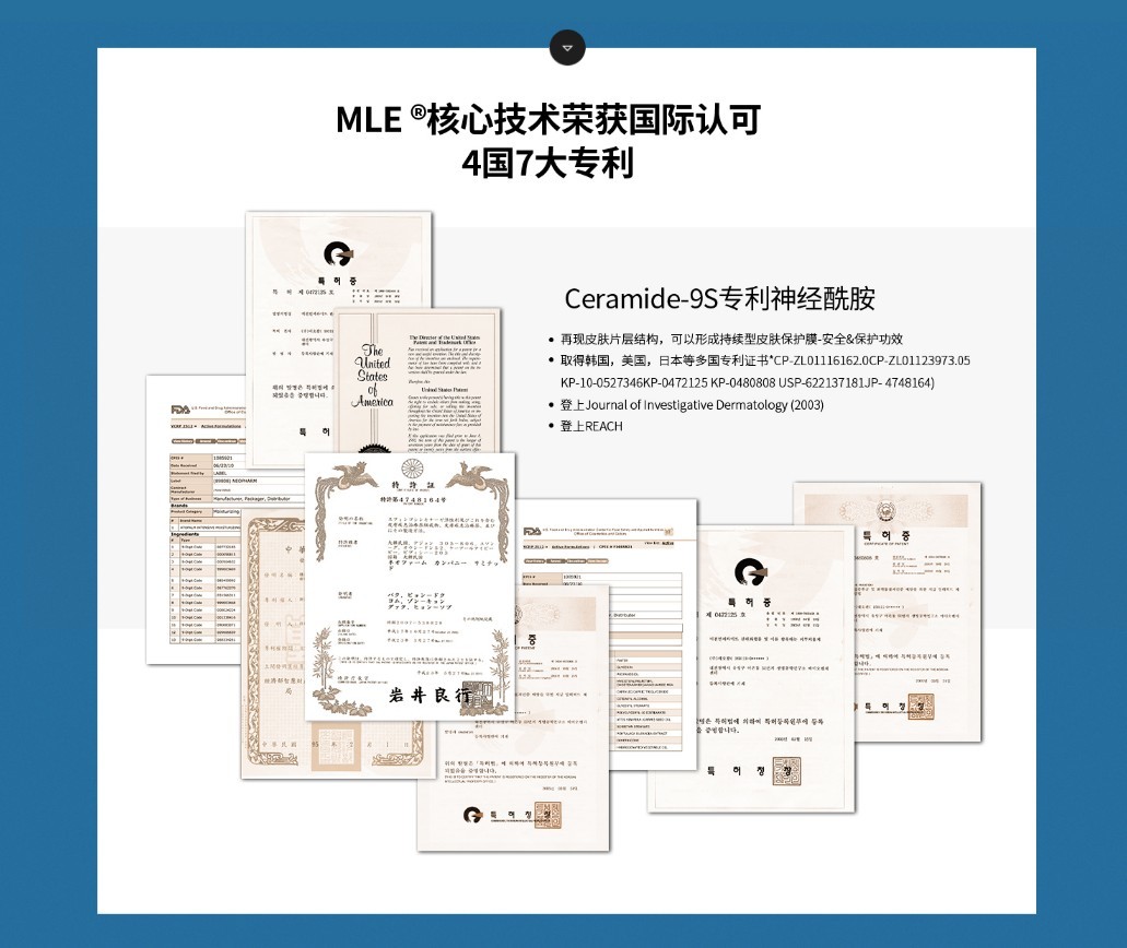 DermaB品牌的诞生于得益于新药集团前身医药研发的背景,从1997年类似神经酰胺研究开始,将生命工学、皮肤科学技术 基础上研发了皮肤生理活性物质神经酰胺,与皮肤各层存在的脂质结构,于2000年取得DermaB得妈贝皮肤屏障核心技术(MLE),并获得韩国,中国,日本,美国等多国认证。MLE专利技术可有效保护与再现肌肤脂质结构从而使有效成分可以加快吸收和利用,同时保持肌肤的水润弹性。