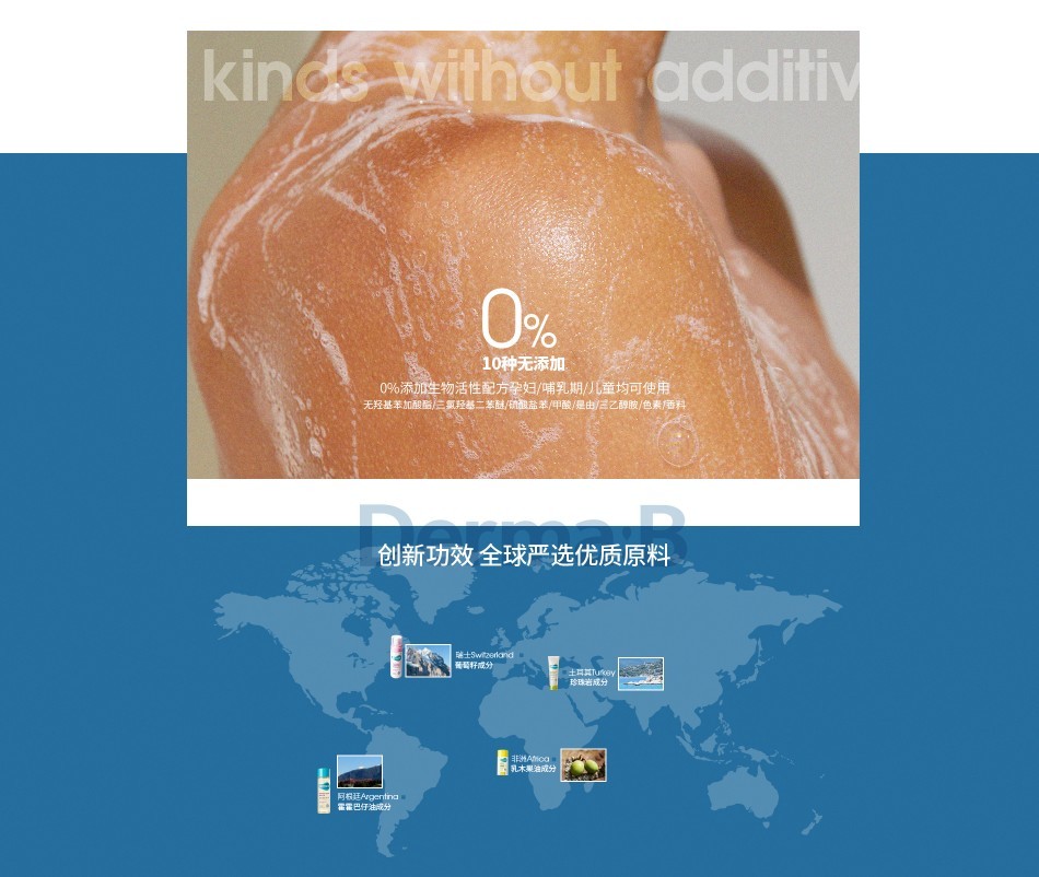 品牌始终坚持10大无添加的理念,不添加对身体有害成分,比如易致敏的防腐剂,矿物油,色素, 香料,酒精,硫酸盐等。因此DermaB产品孕妇儿童均可使用。同时坚持天然植物成分添加,一款身体乳甚至会添加十几种植物配方,这一减一加,充分体现了品牌对产品的高标准要求。