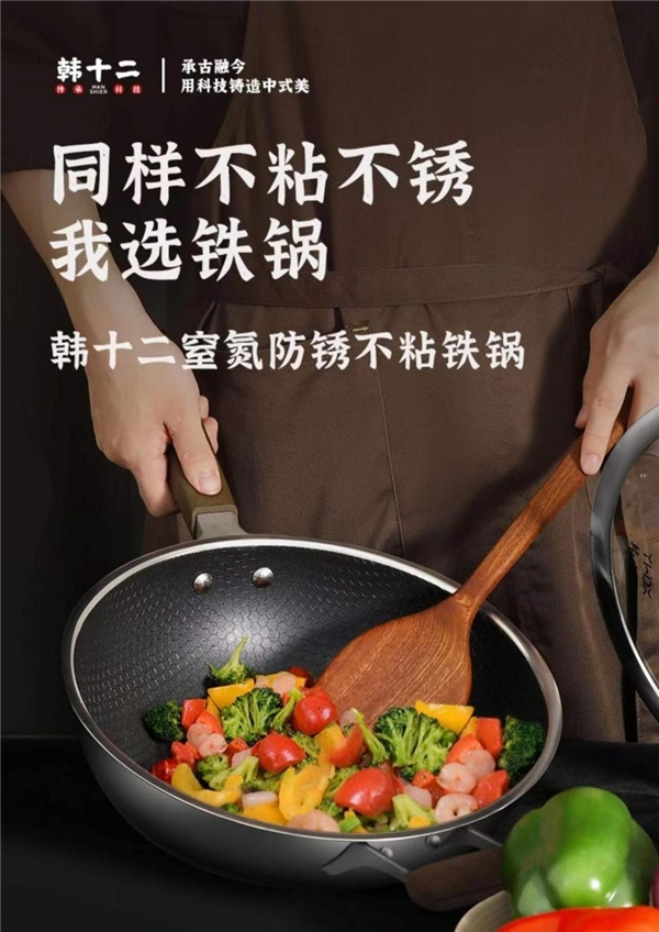 当下,大多数中国家庭还是习惯使用传统烹饪工具——铁锅。只因铁锅更适合爆炒,做菜更香,也更有“锅气”。但是传统铁锅需要“开锅”,保养不得法易生锈,既摧毁家人对烹饪的热情,又对健康造成很大隐患。韩氏铁锅铸造工艺,源于富有传奇色彩的莫干山。清末,韩氏第三代传人本着传承铁器铸造术的初心,每口铁锅都经过上万次锻打,因其不易生锈,适合爆炒,风靡一时。经过百年传承与工艺求索,韩氏第十二代传人结合窒化渗氮技术与不粘蜂窝结构,真正做到了让韩十二铁锅无需开锅养锅,不粘不锈,它比不锈钢锅导热更迅速,火力旺盛,受热均匀,更易锁住香气。从清末到当今,韩氏铁锅始终坚守优良品质,传承经典、勇于创新、彰显国货的自信与品质,在时代变迁中重新定义中式厨房烹饪新体验。