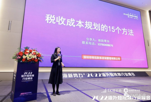 特讯联合创始人、跨境电商高级财税顾问欧阳翠华,现场给峰会观众分享了最新税务动态解读、13个跨境电商常见风险和15个关于跨境电商税收成本规划的的技巧。