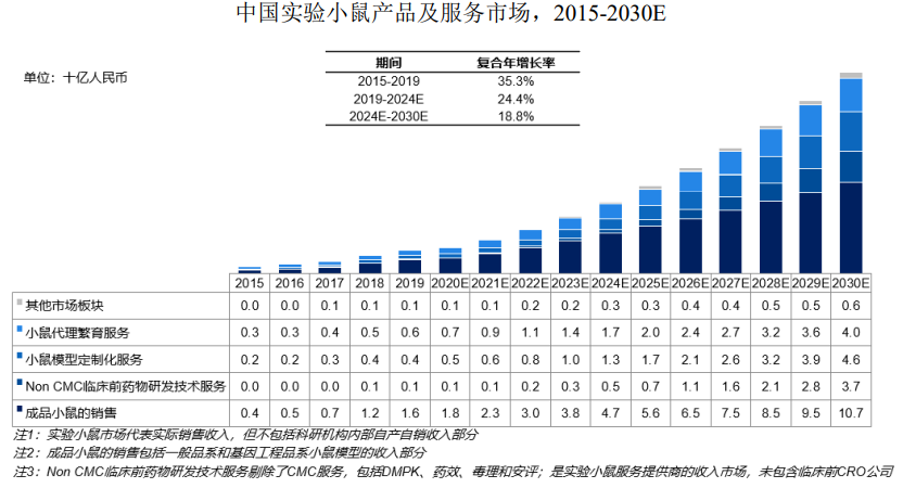 市场规模方面,根据集萃药康招股说明书披露,中国实验小鼠产品及服务市场2019 年市场规模为 28 亿元,预计到 2024 年市场规模将达到 84 亿元人民币,复合年增长率约为 24.4%;到 2030 年,国内实验小鼠产品和服务的整体市场规模将达到 236 亿元人民币。
