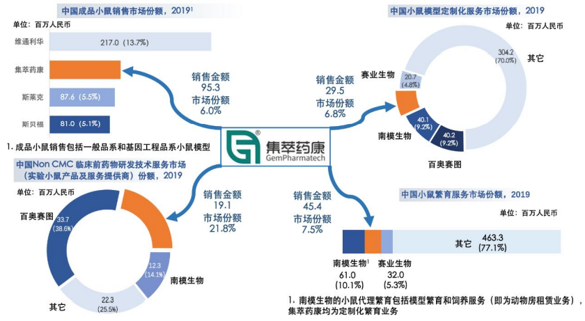 行业竞争格局方面,根据集萃药康招股说明书,2019年中国实验小鼠产品及服务市场中,维通利华系 Charles River 在中国的子公司,业务收入规模为 2.2 亿元人民币,市场占比为 7.7%,居于首位,业务类型主要为成品小鼠销售,2019 年集萃药康业务收入规模约为 1.9 亿元人民币,市场占比为 6.7%,居于第二。