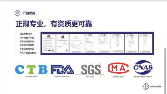 慧眠系列产品获得国际公认的SGS安全检测报告,及国际公认产品品质最高荣誉的美国FDA认证、深圳权威检测机构CTB认证、中国计量MA认证标志、中国合格平定国家认可委员会CNAS等多项资质。可以直接进入国际市场。先后获得有中国睡眠研究会理事单位会员、质量服务·诚信AAA级企业、中国自主创新产品、中国3.15消费者可信赖产品等诸多荣誉称号。此外,慧眠品牌申请有国际专利技术,纯外用敷抹产品,不参与头皮吸收,不参与血液循环,不参与脏腑代谢,对人体器官没有伤害。