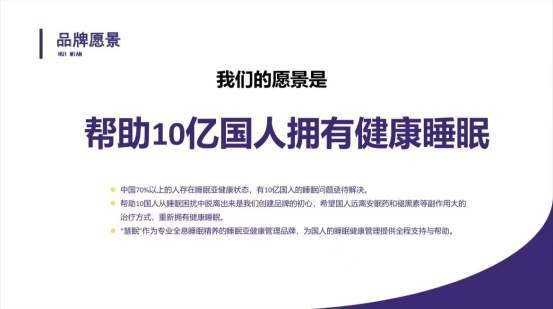 慧眠,希望国人远离安眠药和褪黑素等副作用大的治疗方式,打造一款没有副作用,安全有效的“全息睡眠睡眠精养”产品,从“入睡快”、“睡的深”、“睡的长”三个维度,来帮助人们全方位的提高睡眠质量,倡导“养生先养眠”的养生方式,帮助国人重新拥有健康睡眠。