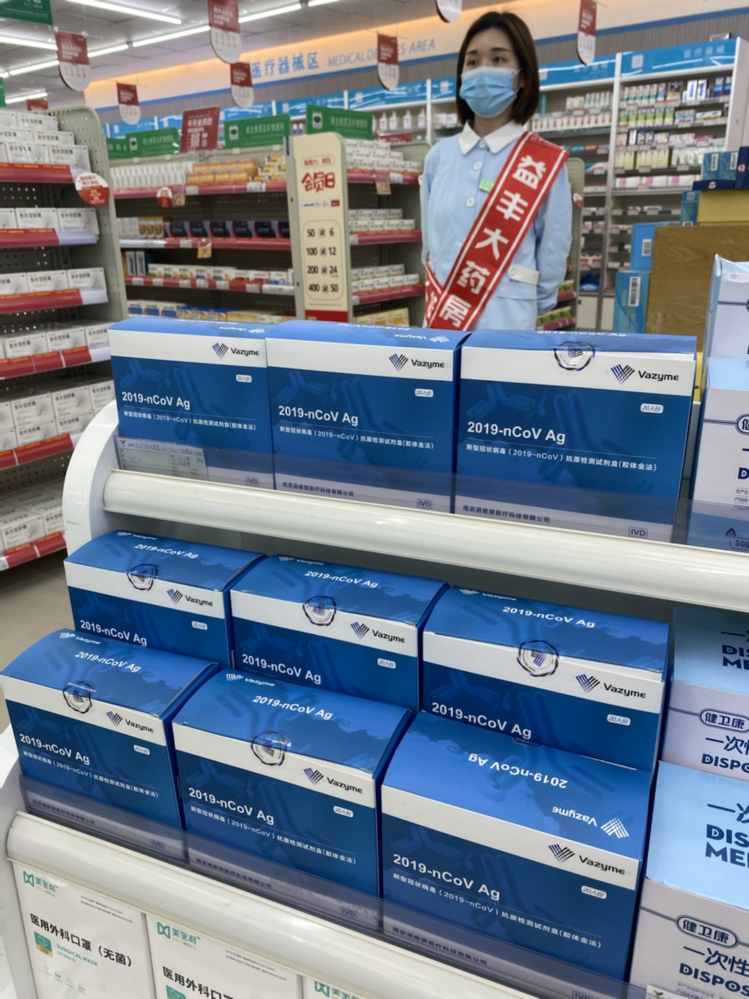 3月15日,益丰大药房首批新冠病毒抗原检测试剂盒已在南京市部分门店上架开售,居民可在线下药店购买到适合自我检测的新冠病毒抗原检测产品。