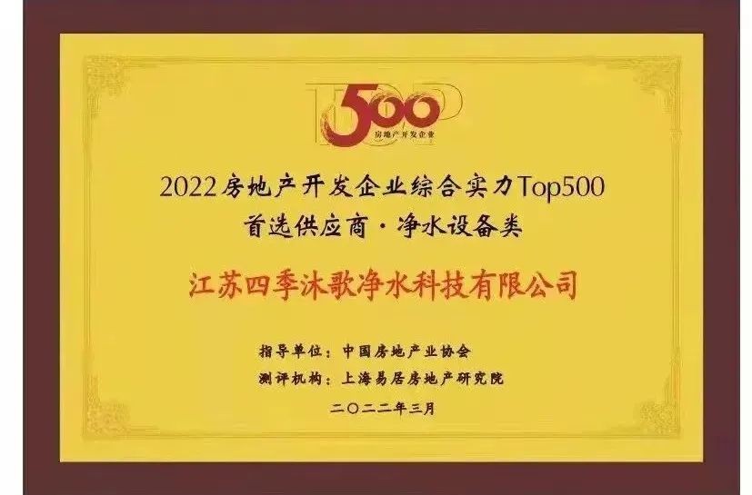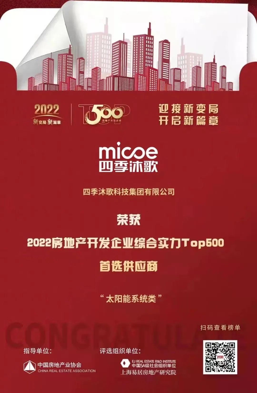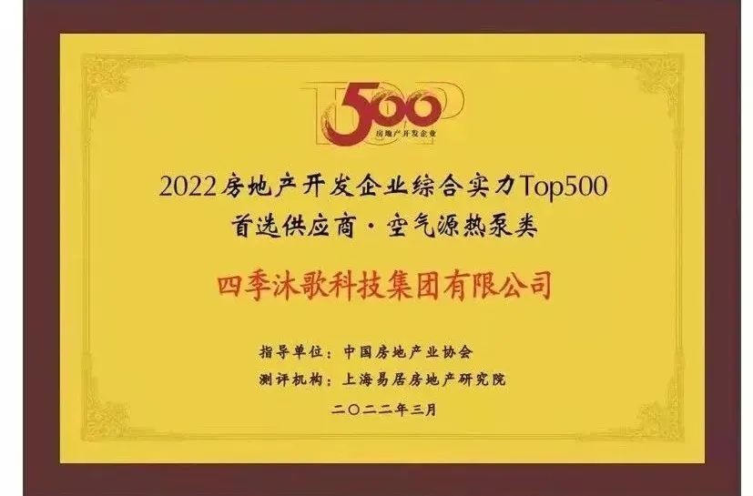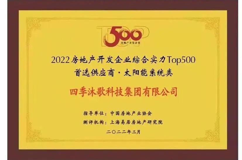 3月29日,中国房地产业协会“房地产开发企业综合实力Top500首选供应商”测评报告2022版正式发布。四季沐歌科技集团有限公司凭借领先的综合实力荣膺“2022年房地产开发企业综合实力TOP500首选供应商”空气源热泵类、太阳能系统类及净水设备类代表企业,四季沐歌已连续九年入围该榜单。