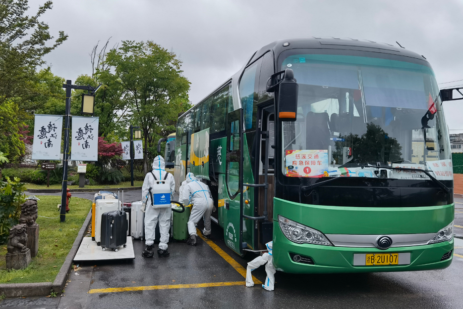 4月13日零时,转运任务启动,慧和大厦1031名群众乘坐转运客车,奔赴慈溪、象山隔离点。64辆客车驾驶员执行完慈溪、象山转运任务后,经过车辆消杀处理,与随后到达的客车汇聚成钢铁洪流,立刻赶赴万里学院。