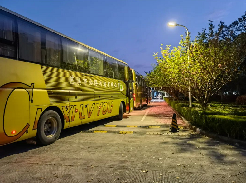 23:45,先期64辆客车已赶到慧和大厦集结地点,毛磊立即赶赴现场,指挥调度客车停放。