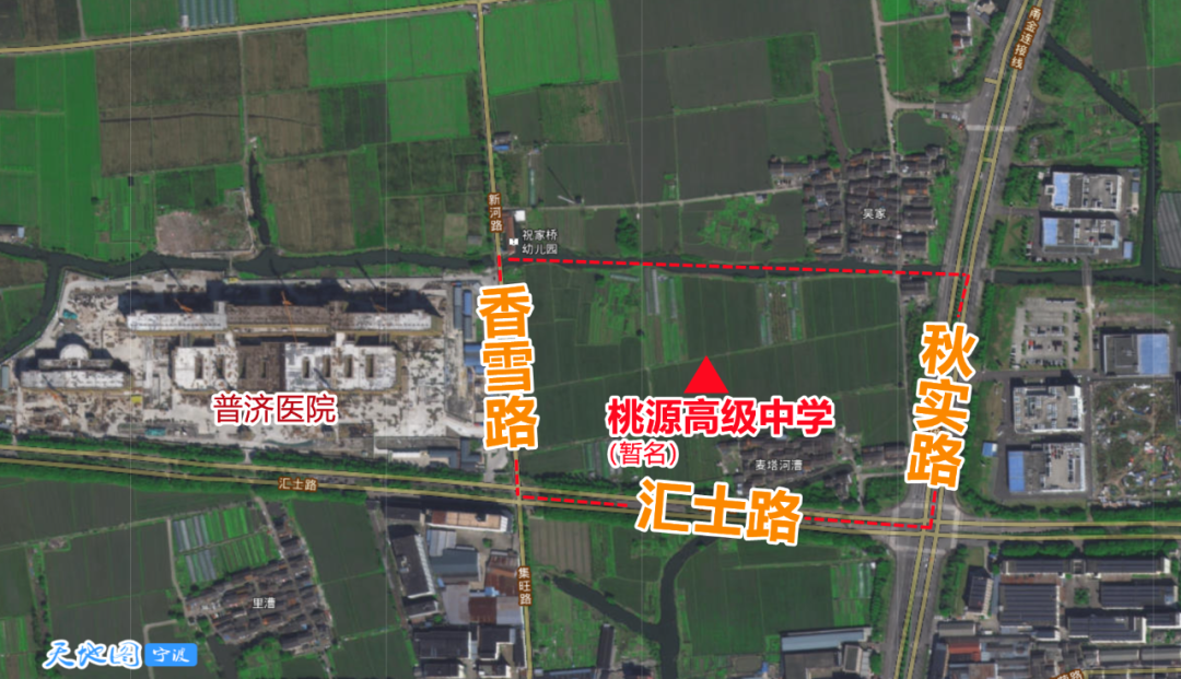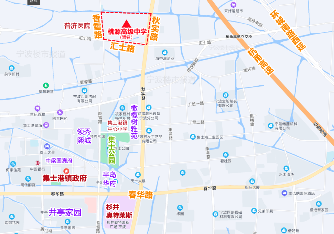 位于海曙集士港镇,南至汇士路、北至规划河道、西至香雪路、东至秋实路——就在普济医院的东侧,距集士港镇中心还有点距离。