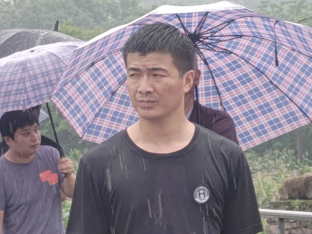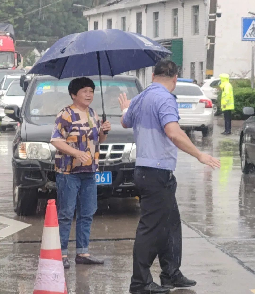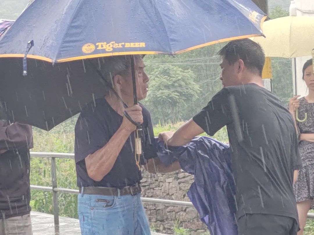 白发苍苍的老人,见拗不过队员们的执着,不顾劝说依旧不愿离去,在身后默默为队员打伞,眼里尽是感激与慈祥。