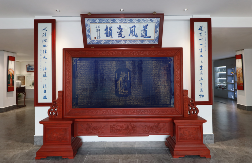 (图 5《道德经霁蓝釉手刻瓷板》|长3米,高2米,两道窑火,高温1320℃窑火烧制色釉瓷板,低温600℃红炉烤金、高温手工雕刻瓷板画。“釉下成瓷,刀刻成书,五千余字,错一尽毁;良工心苦,精雕细琢,传世佳作,丹青不渝”。藏于中道美学馆)