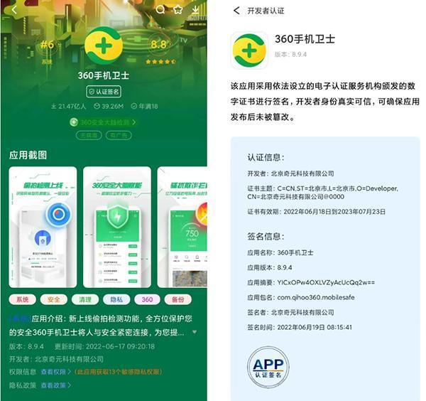 360手机助手会对获得签名后的开发者APP进行显著标识。对已经申请了电子认证服务机构数字证书的开发者,当检测到其有开发者签名时,360手机助手会在APP下载详情页,明确展示“认证签名”logo和标签。同时,当点击标签,会在二级页,详细展示完善的认证信息,包括“认证信息”和“签名信息”。