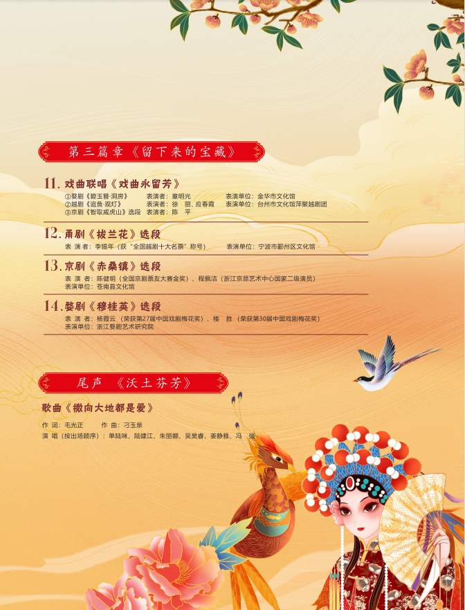 整场晚会由三个主题组成,分别为 《戒不掉的腔调》、《忘不了的乡情》、《留下来的宝藏》 。节目从历届浙江省十大城市戏曲演唱联赛中邀请了优秀获奖票友,为展现全省各地的“乡情乡音”还邀请了甬剧、睦剧、台州乱弹、瓯剧等地方剧种,更有全国戏曲名家、“梅花奖”获得者的惊艳登场,可谓是名家名票齐登台,共吟梨园竞芬芳。