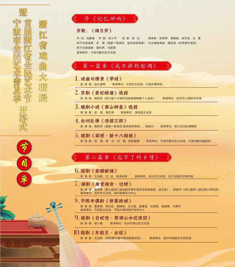 6月28日晚, “喜迎二十大·同走共富路”浙江省戏曲大联展暨首届浙江省全民艺术节、宁波市全民艺术普及季开幕式 在宁波市鄞州区文化艺术中心拉开帷幕。此次活动共分为两个部分:“喜迎二十大·同走共富路”首届浙江省全民艺术节、宁波市全民艺术普及季开幕式,“喜迎二十大·同走共富路”浙江省戏曲大联展。