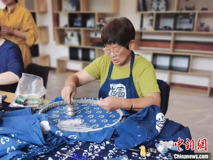 左手拿着刺绣框,右手娴熟地穿针引线,66岁的赵玉红在蓝印花布上,按照提前设计部位要求快速地进行金银绣,一会儿工夫,一只翩翩欲飞的银白色蝴蝶跃然于蓝白相间的布上。